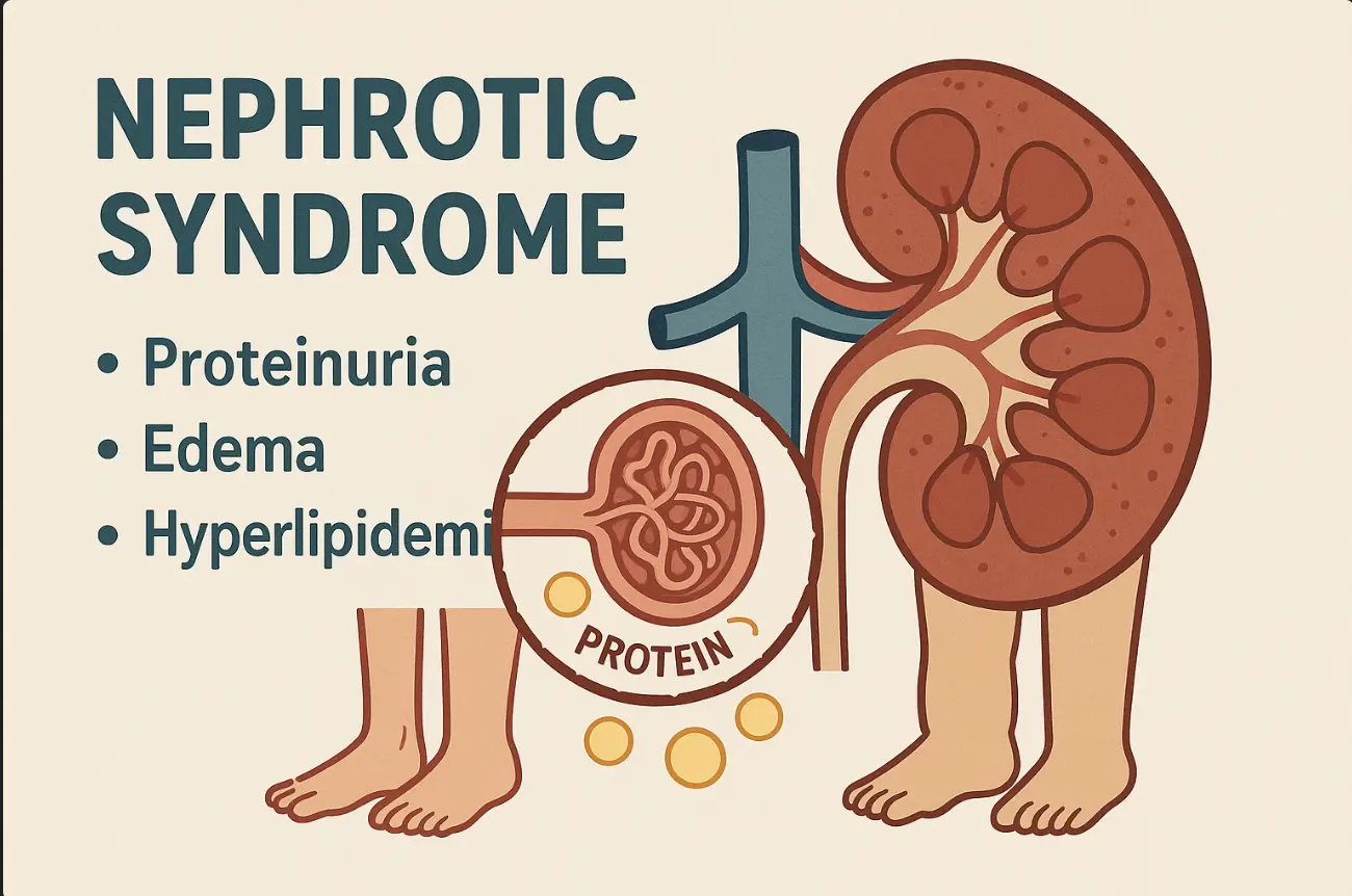 Nephrotic syndrome is a health condition where the kidneys start leaking large amounts of protein into the urine. Normally, urine doesn’t have much protein, but in nephrotic syndrome, the filters in the kidneys (called glomeruli) become weak or leaky. This causes protein to leak from the blood out into the urine, making the urine frothy.